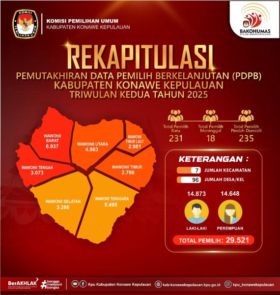 Pelaksanaan Rapat Pleno Terbuka Rekapitulasi Daftar Pemilih Berkelanjutan Triwulan Kedua Tahun 2025 Tingkat Kabupaten Konawe Kepulauan dilaksanakan pada Pukul 15.30 Wita Bertempat di Kantor Komisi Pemilihan Umum Kabupaten Konawe Kepulauan.