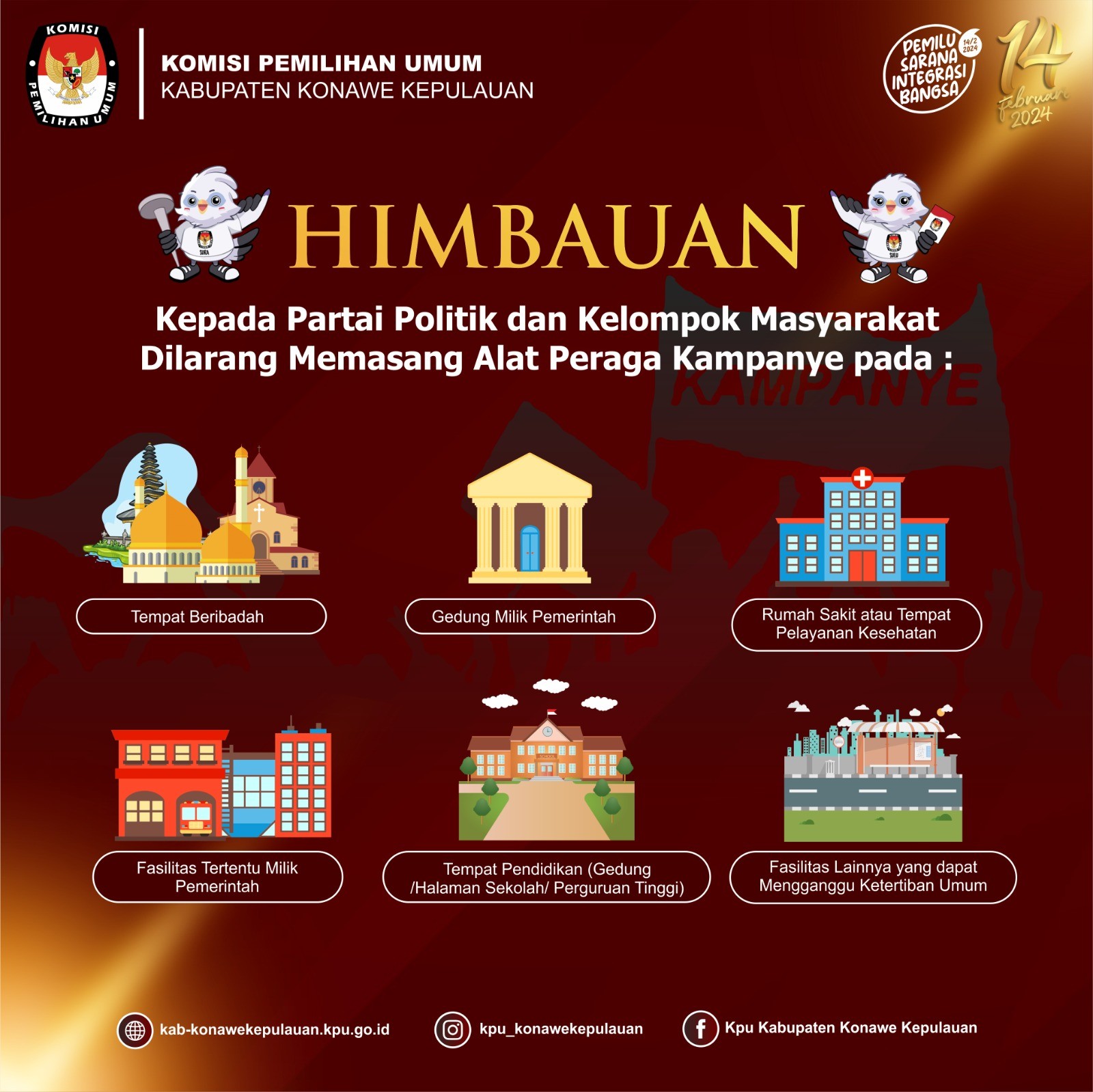 KonaweKepulauanKPU-Komisi Pemilihan Umum Kabupaten Konawe Kepulauan menghimbau kepada Partai Politik dan Kelompok Masyarakat dilarang memasang Alat Peraga Kampanye Pada :