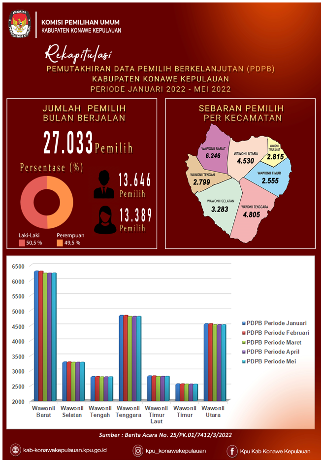 Berikut Infografis Rekapitulasi Pemutakhiran Data Pemilih Berkelanjutan (PDPB) Kabupaten Konawe Kepulauan Periode Januari 2022 - Mei 2022