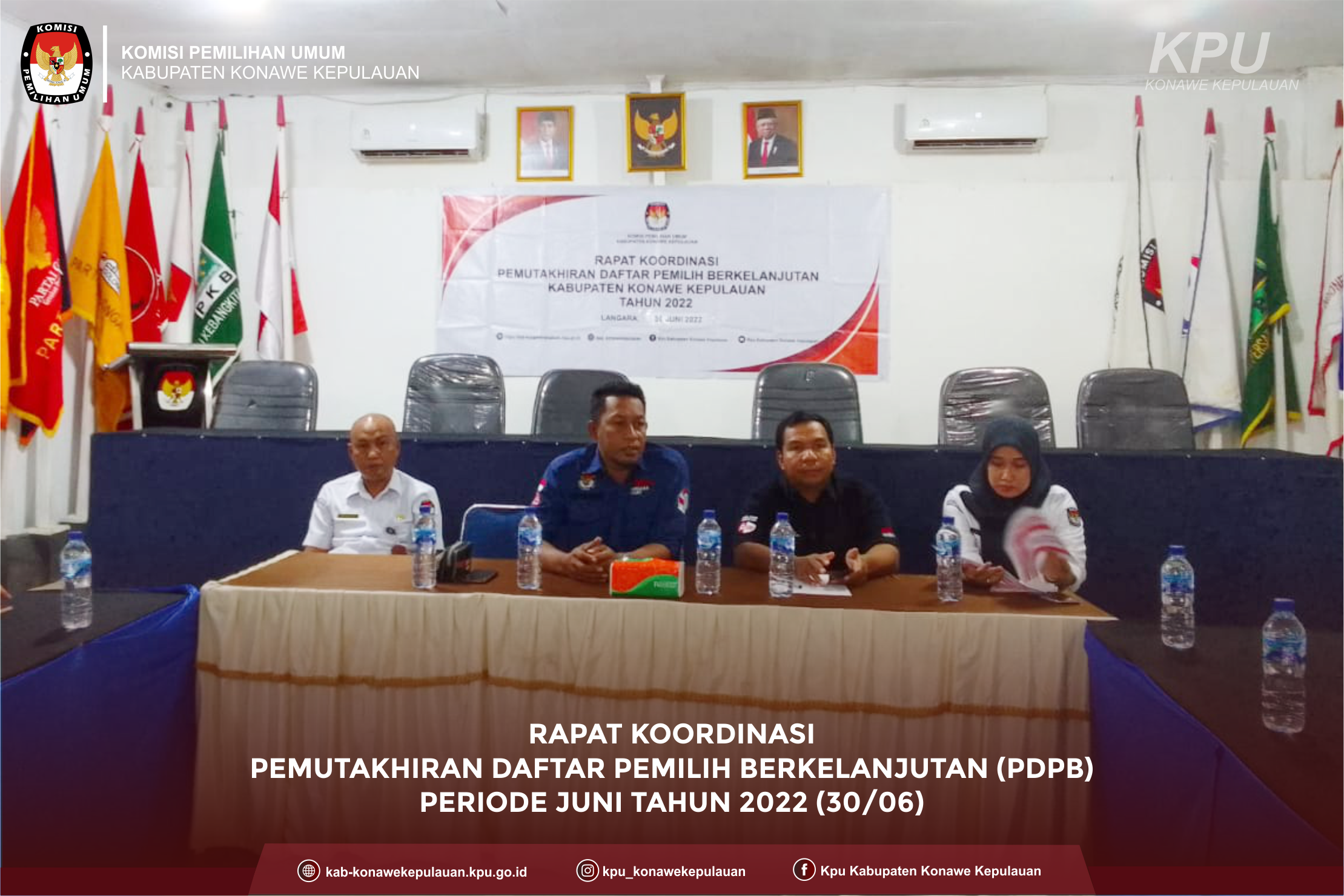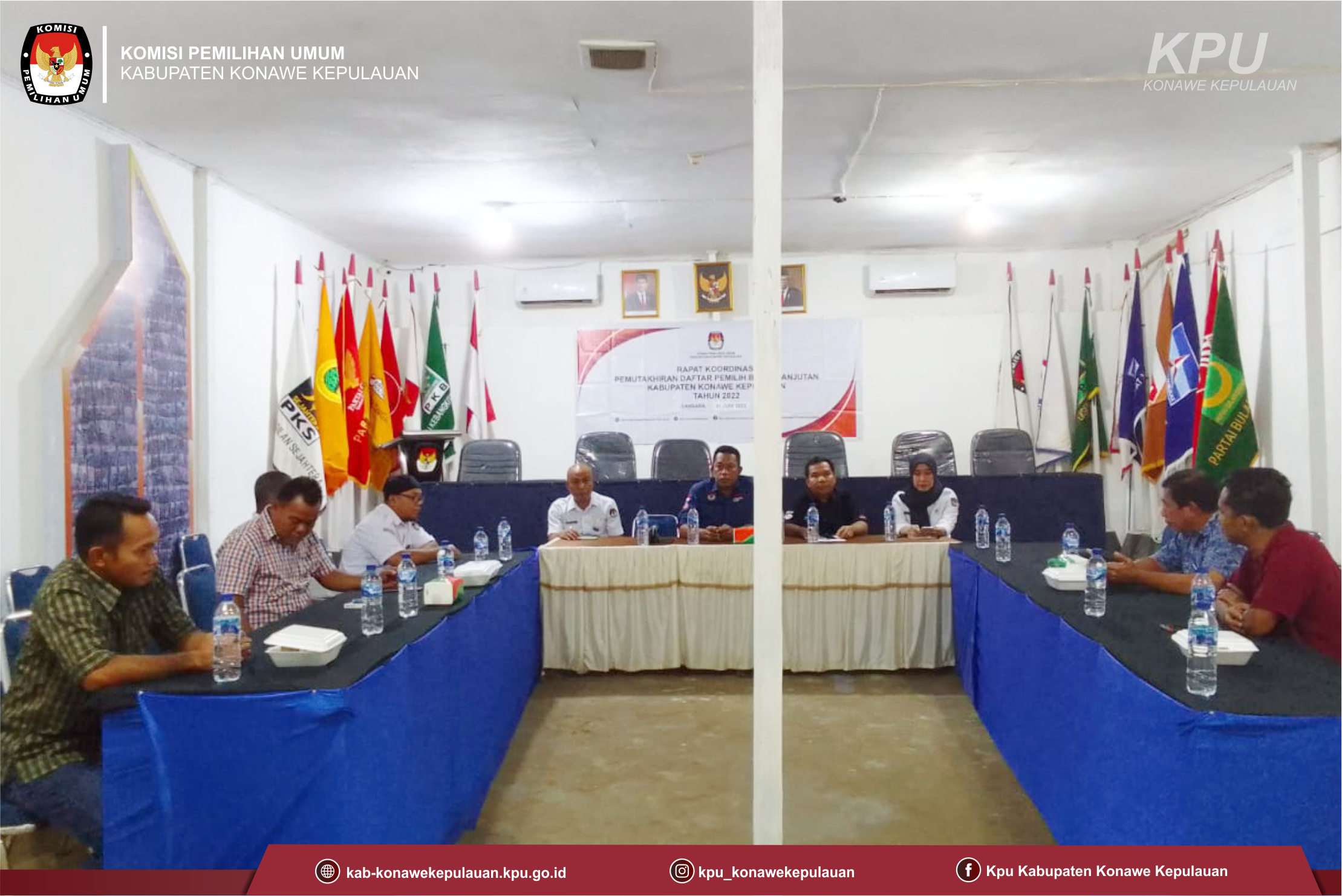 KonaweKepulauan–Komisi Pemilihan Umum Kabupaten Konawe Kepulauan menyelenggarakan Rapat Koordinasi Pemutakhiran Data Pemilih Berkelanjutan Triwulan II Tahun 2022 Tingkat Kabupaten Konawe Kepulauan di Aula Kantor KPU Kabupaten Konawe Kepulauan, Kamis (30/06/2022). Kegiatan ini dihadiri oleh Kepala Dinas Kependudukan dan Catatan Sipil Kabupaten Konawe Kepulauan, Ketua Bawaslu Kabupaten Konawe Kepulauan, Perwakilan dari Polsek Wawonii, dan perwakilan dari Partai Politik se-Kabupaten Konawe Kepulauan.