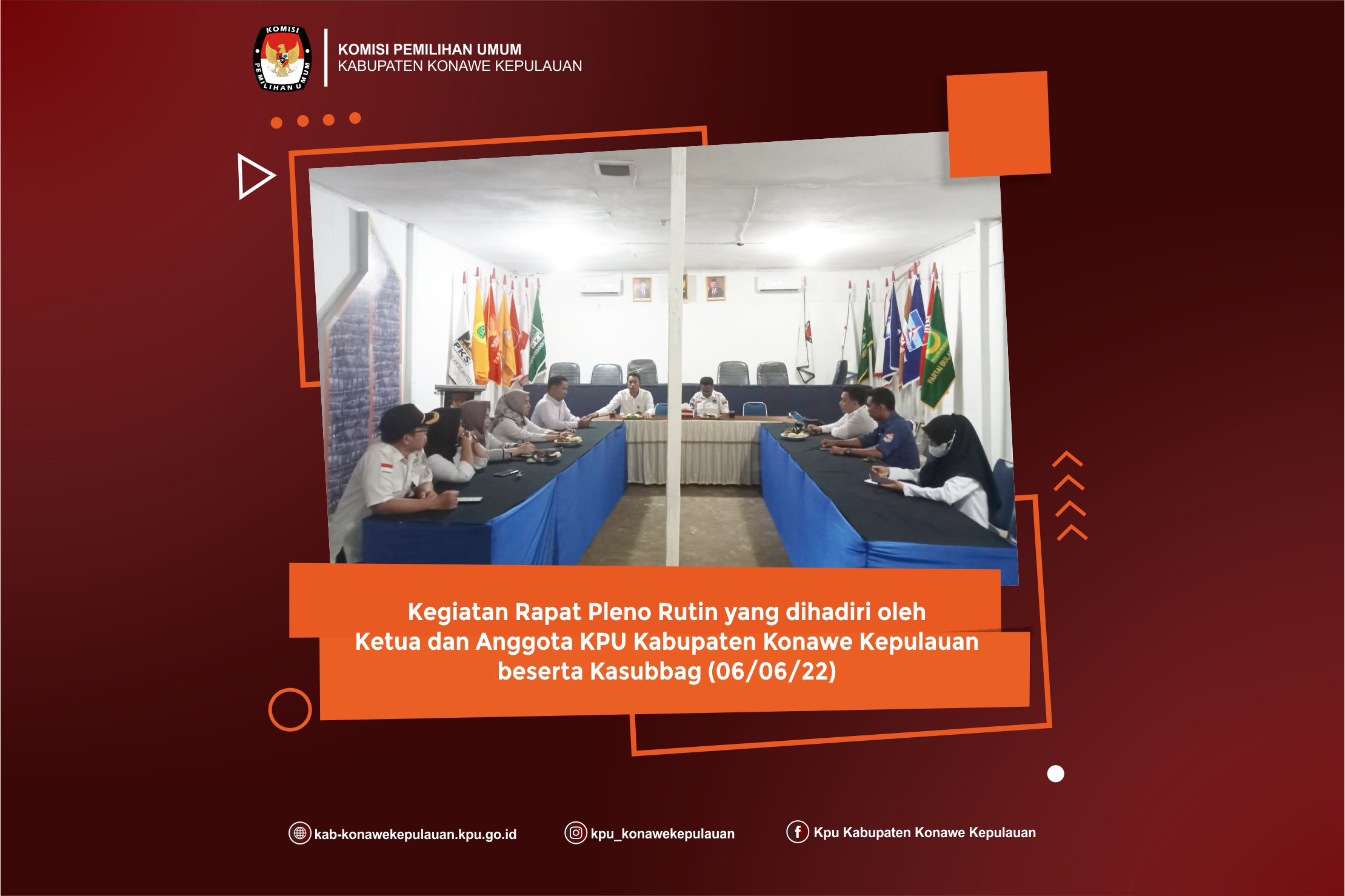 KonaweKepulauanKPU-Komisi Pemilihan Umum Kabupaten Konawe Kepulauan Melaksanakan Agenda Rapat Pleno Rutin pada hari Senin, 06 Juni 2022 di AULA Kantor KPU Kabupaten Konawe Kepulauan yang dibuka oleh Iskandar, Ketua KPU Kabupaten Konawe Kepulauan Dengan peserta Pleno : Anggota KPU Kabupaten Konawe Kepulauan beserta Kasubbag. [adm]