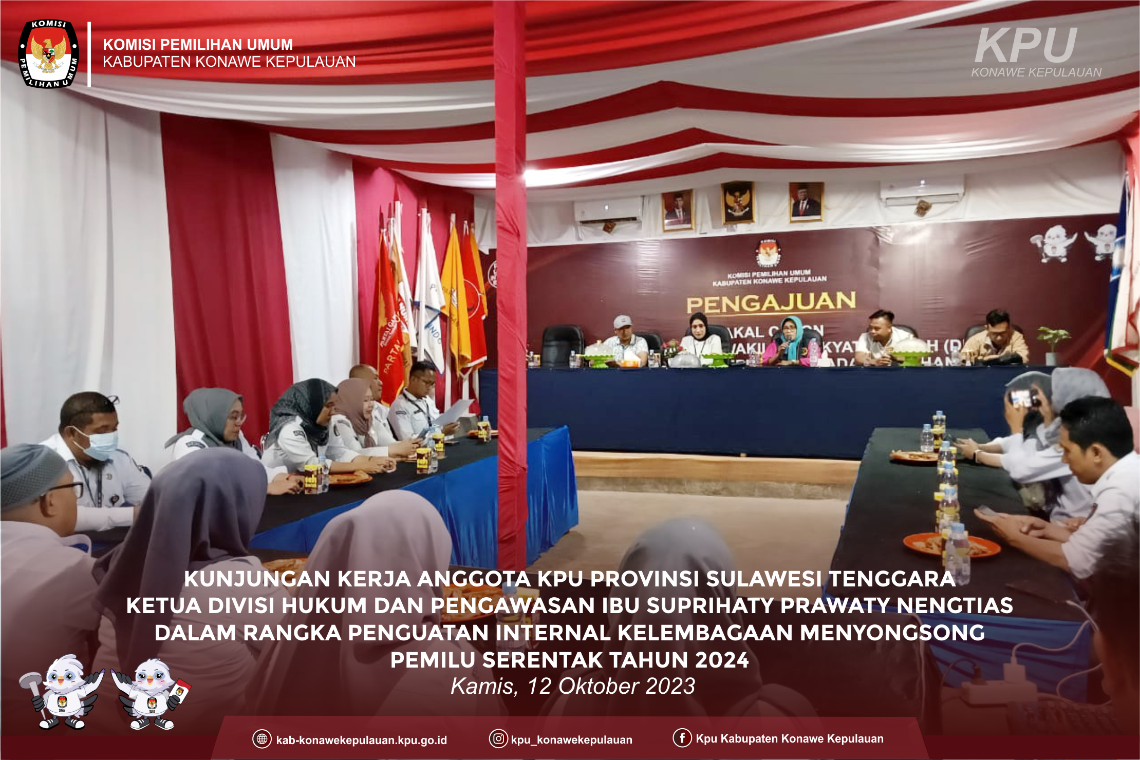 KonaweKepulauanKPU-Komisi Pemilihan Umum Kabupaten Konawe Kepulauan Mendapat Kunjungan Kerja dari Anggota KPU Provinsi Sulawesi Tenggara Ibu Suprihaty Prawaty Nengtias (Ketua Divisi Hukum dan Pengawasan) didampingi Kasubbag Hukum dan SDM Bapak Taufik Ahmad dan Staf Sekretariat KPU Provinsi Sulawesi Tenggara. Kamis, (12/10/23)