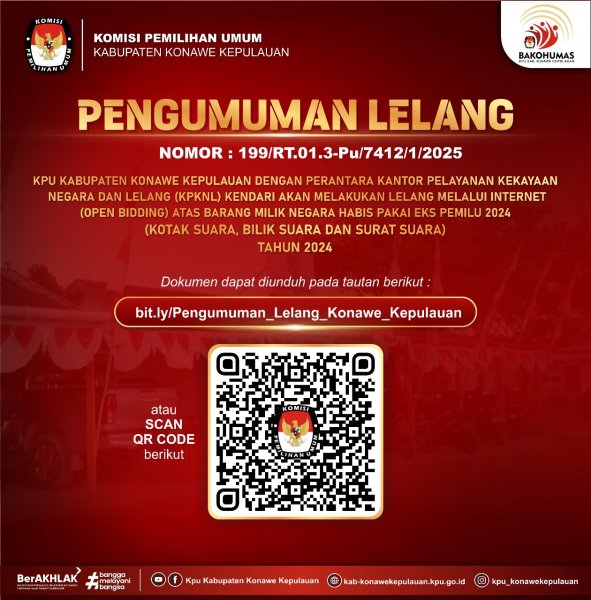 KonaweKepulauanKPU-Komisi Pemilihan Umum Kabupaten Konawe Kepulauan mengumumkan Lelang Melalui Internet (Open Bidding) atas Barang Milik Negara Habis Pakai Eks Pemilu 2024 (Kotak Suara, Bilik Suara dan Surat Suara) Rabu, (02/07/25)