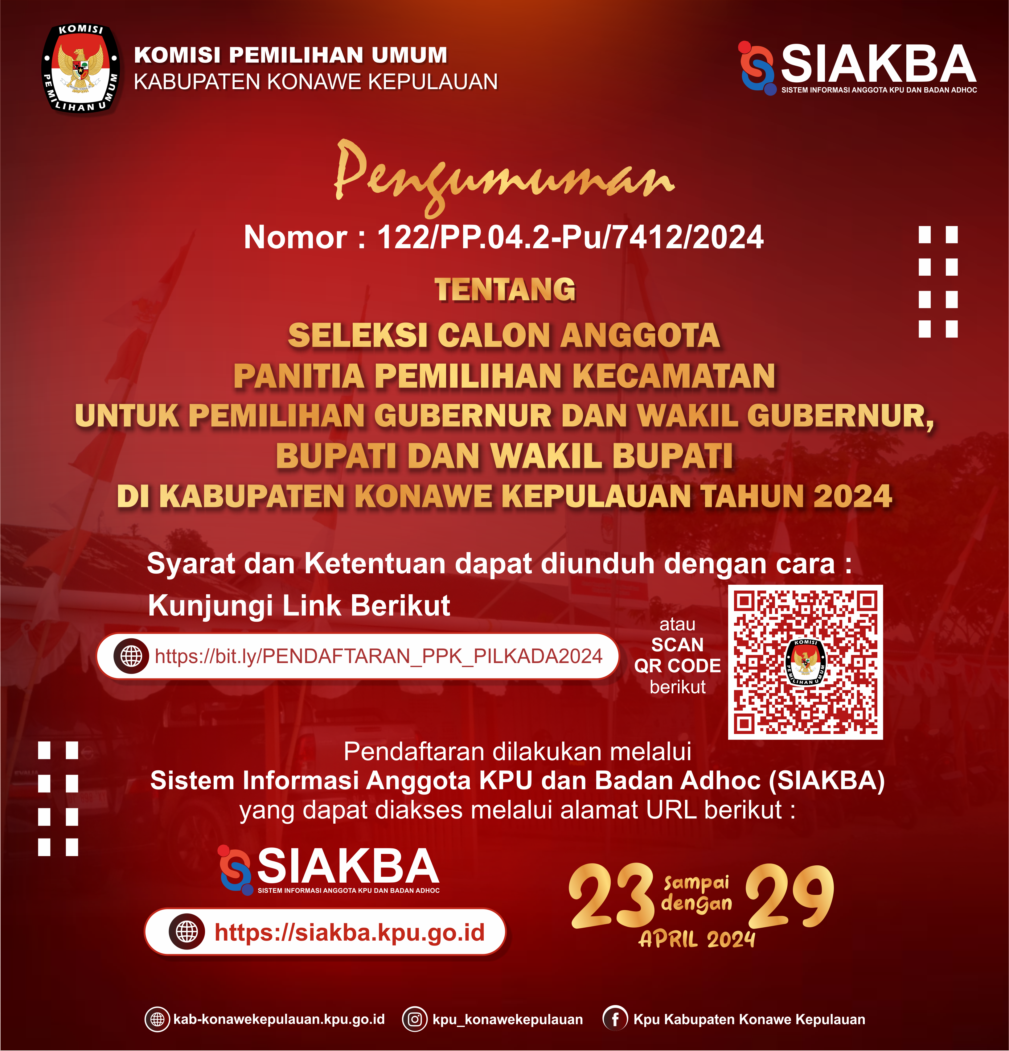 KonaweKepulauanKPU-Komisi Pemilihan Umum Kabupaten Konawe Kepulauan mengumumkan Pendaftaran Calon Anggota PPK untuk Pemilihan Bupati dan Wakil Bupati Konawe Kepulauan Tahun 2024. Selasa, (23/04/24)