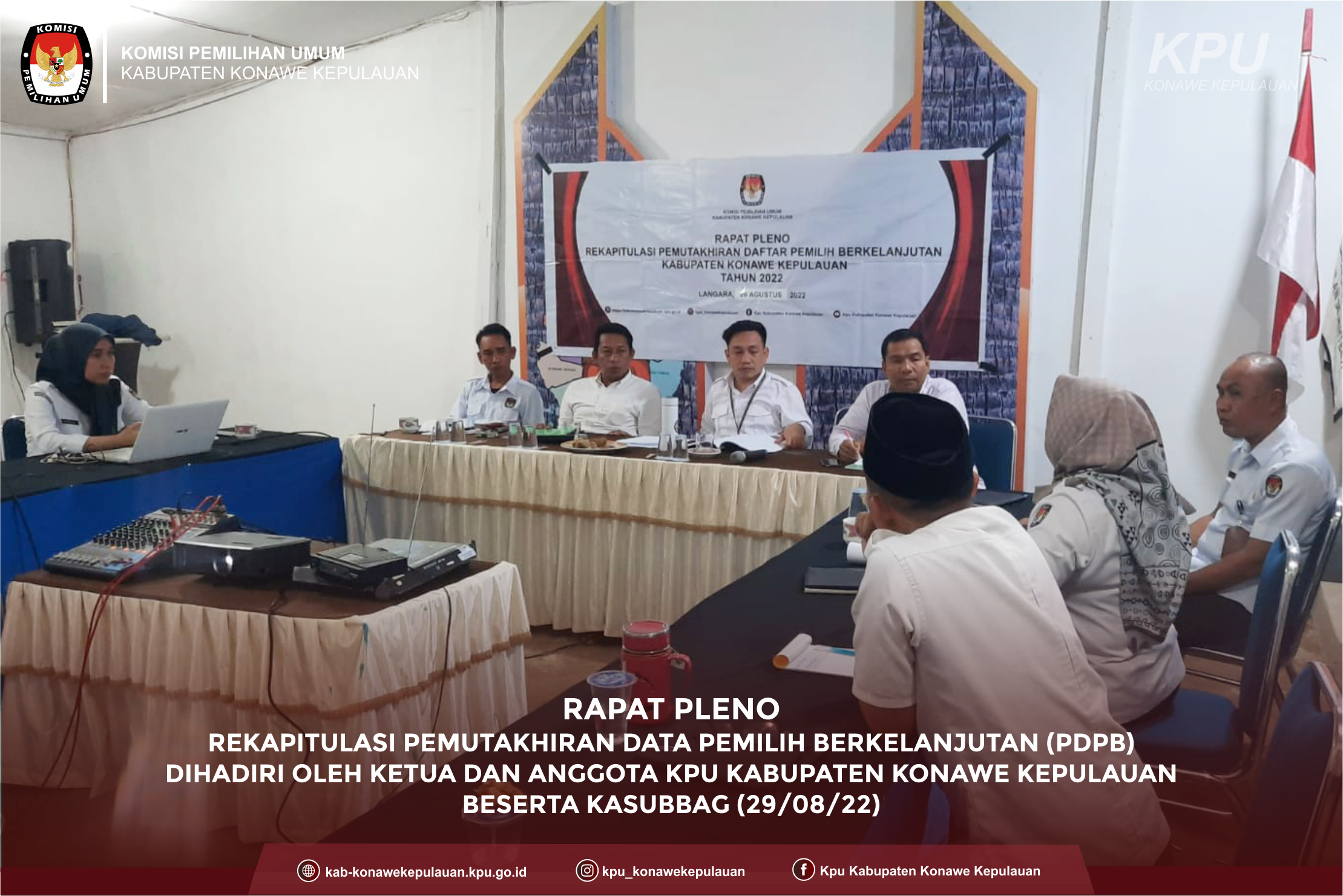 KonaweKepulauanKPU-Komisi Pemilihan Umum Kabupaten Konawe Kepulauan menggelar Rapat Pleno Internal Rekapitulasi Pemutakhiran Data Pemilih Berkelanjutan Tingkat Kabupaten Konawe Kepulauan Periode Agustus 2022 bertempat di Aula Rapat KPU Kabupaten Konawe Kepulauan pada hari Senin (29/08).