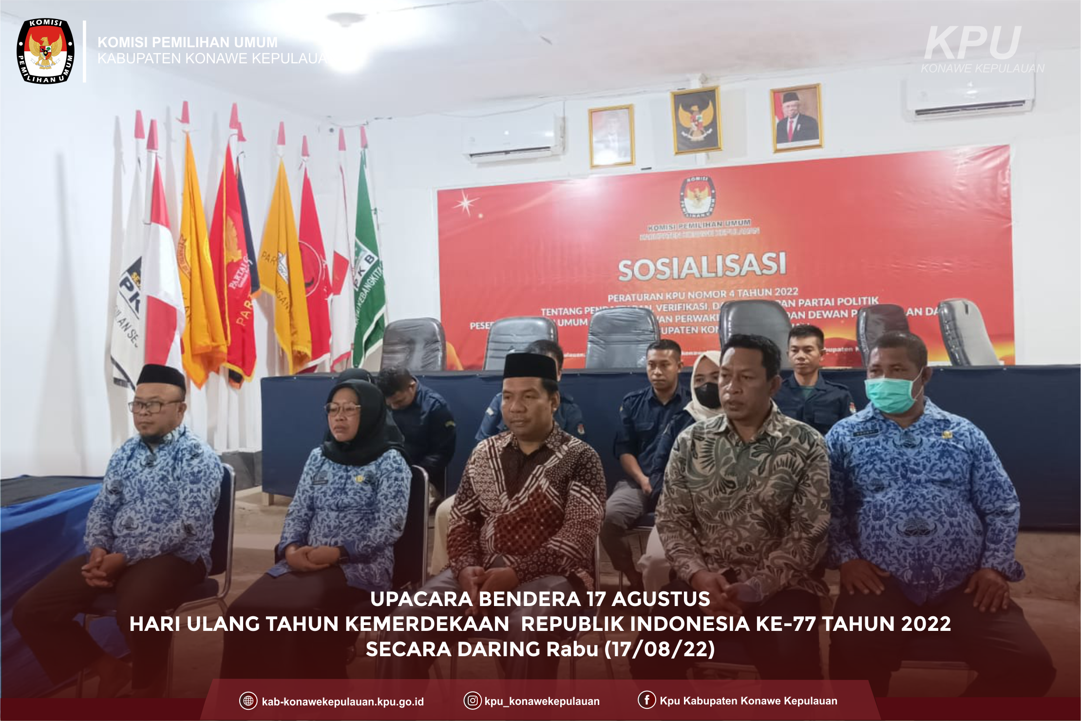 KonaweKepulauanKPU-Komisi Pemilihan Umum Kabupaten Konawe Kepulauan Mengikuti Upacara Peringatan HUT Kemerdekaan Republik Indonesia Ke-77 Tahun 2022 di AULA Kantor KPU Kabupaten Konawe Kepulauan secara daring yang diikuti seluruh KPU Kab/Kota Se-Sulawesi Tenggara. Rabu, (17/08/22)